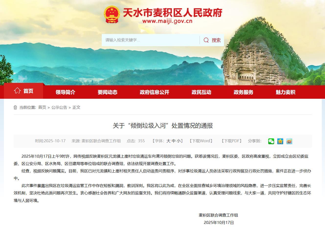 央视网消息:据甘肃省天水市麦集区人民政府网站报道,甘肃省天水市麦集区联合调查工作组通报称,10月17日上午9点左右,网上发布一段视频,反映麦集区元乐镇雅村渭区河中一辆垃圾车倾倒问题。得知情况后,麦集区委、区政府高度重视,立即成立了由区区巡视监委、区保卫局、水务单位组成的联合调查组,区政府依法依规处置。经查,视频中反映的问题属实。目前,麦集区已对元龙镇、上雅村相关责任人启动问责程序,并给予行政拘留依法对废物清除人员采取处罚措施。该案正在进一步调查中。此次事件暴露了麦积区垃圾清运管理中的短板和漏洞,提供了深刻的教训。麦集区将以此为鉴,全面排查全区城乡管理领域存在的风险隐患,进一步压实监管责任,健全长效机制,坚决防止问题再次发生。我们衷心感谢社会各界和广大网友的关心和支持。麦集区将继续畅通公共管理渠道,审慎拒绝问题线索,与大家合作保护辖区生态环境和人居环境。