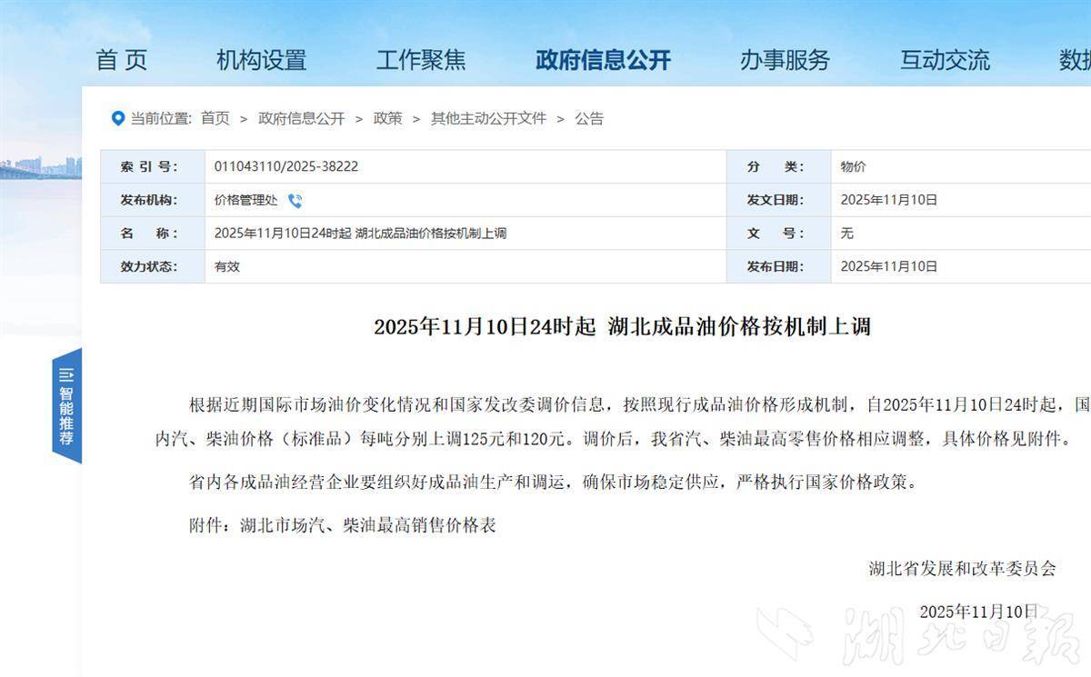 湖北日报讯(记者谢慧敏)油价又要涨了!记者今日从省发改委获悉,11月10日24:00起,我省将上调汽柴油限价。 92号、95号燃油、0号柴油每升分别上涨0.10元、0.11元、0.10元。根据省发改委价格管理价格,根据近期国际市场油价变化和国家发改委调价价格,按照现行成品油价格形成机制,2025年11月10日24:00起,国内汽、柴油价格(标准品)每吨分别上涨125元和120元。调价后,我省汽、柴油最高零售价格也将相应调整。没有。 92号、95号汽油涨至6.95元和7.4元分别上涨4元/升,0号柴油涨至6.57元/升。记者做了一些计算。以油箱容量为50升的普通私家车计算,此次调整后,加注92号汽油将多花费5元。省发展改革委发布最新成品油价格调整通知。本周期是2025年第22次成品油调价。本次调价后,2025年成品油调价将呈现“七涨、九降、六搁浅”的格局。根据目前成品油价格调整情况,下一次调价窗口将于2025年11月24日24:00开启。业内人士表示,根据后市情况,OPEC+增产环境肯定会持续到11月、12月,供应逐渐充裕带来的负面压力依然存在。此外,全球经济我和需求疲弱,负面基本面将持续。总体而言,预计下一轮成品油降价的可能性较大。
