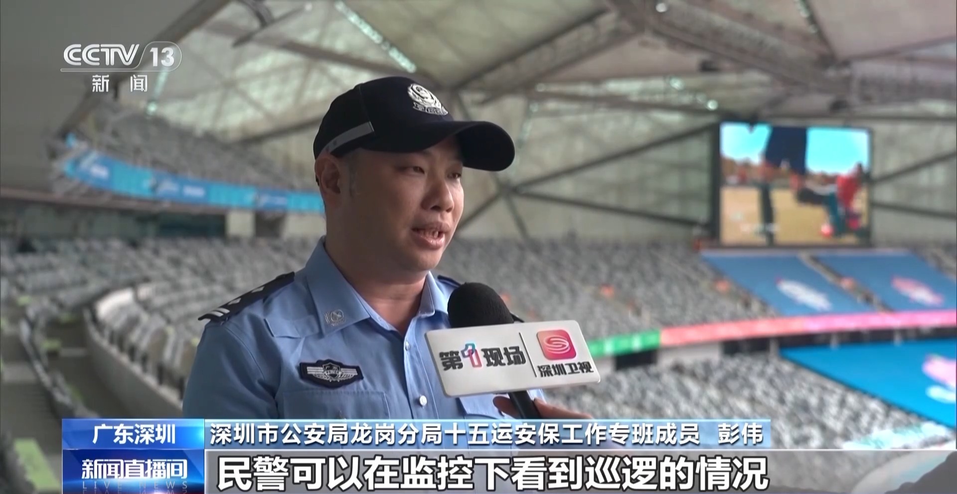 深圳市公安局龙岗分局十五运安保大队队员彭伟:融合5G、人工智能、物联网、云计算、大数据等技术,机器人配备摄像头,警察可以看到被监控巡逻的情况。